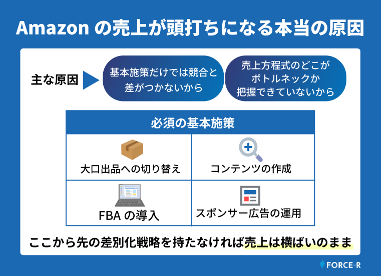 Amazonの売上を伸ばしていくために、広告運用の最適化・FBAの導入・A+コンテンツの作成といった施策をひと通り実行したにもかかわらず、売上が伸び悩んでいませんか。