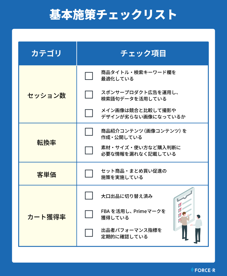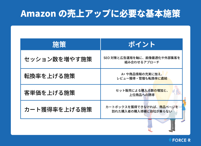 売上方程式の4要素それぞれに対応する基本施策を押さえることが、Amazon販売の土台づくりとして欠かせません。