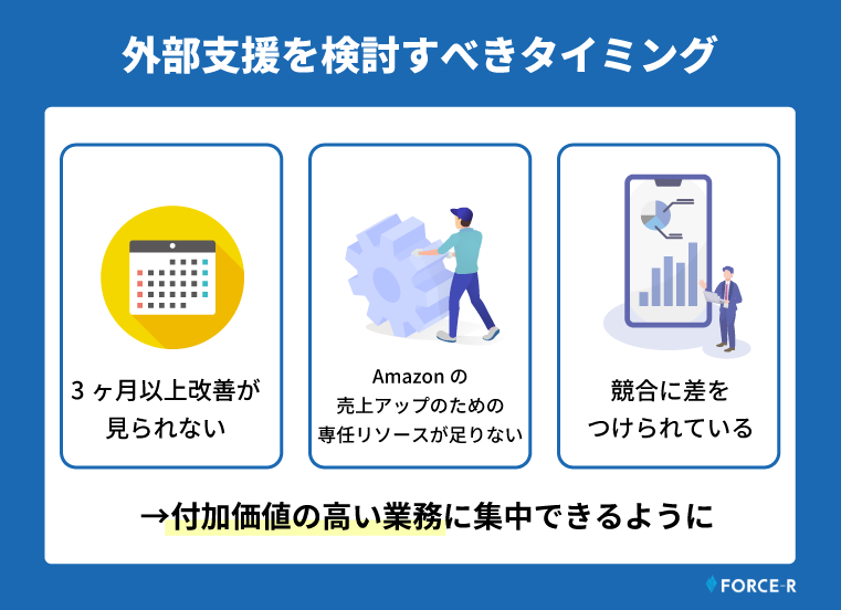ECサイト・Amazon運用に特化した支援会社に依頼することで、成果創出までの期間短縮が期待できます。